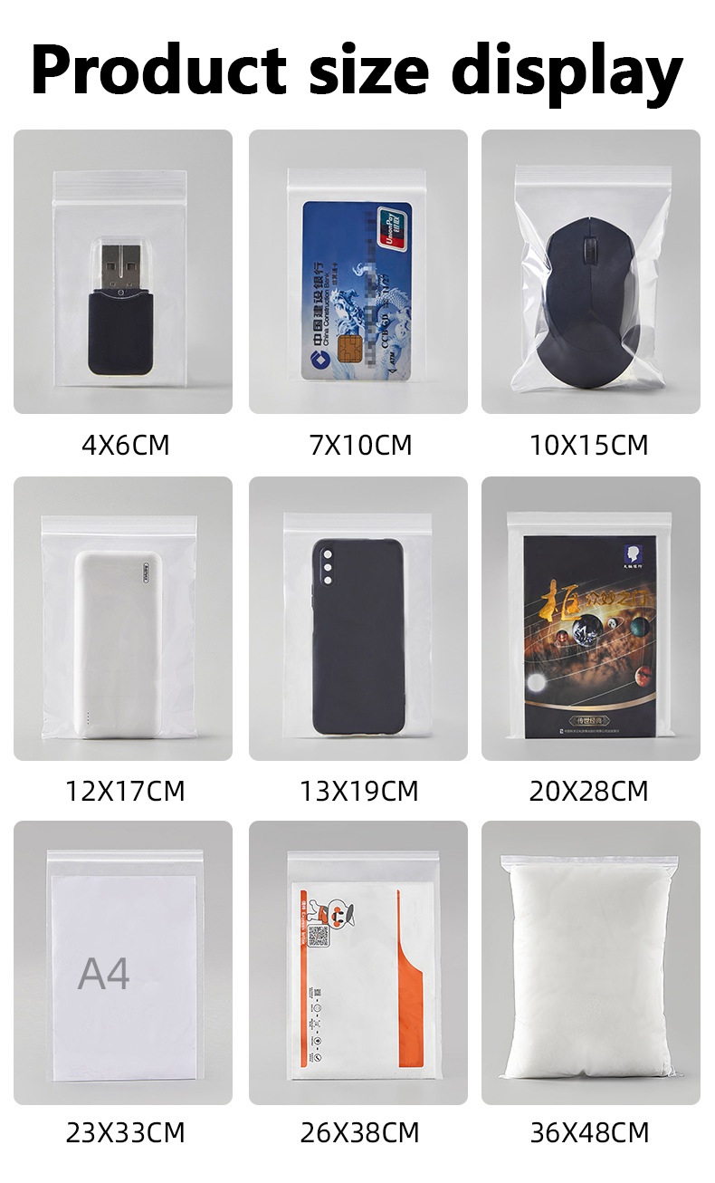 Aplicação: Sacos Ziplock reutilizáveis de diferentes tamanhos são adequados para diferentes campos, como armazenamento, roupas, sapatos, joias, produtos médicos, acessórios de hardware, etc.
